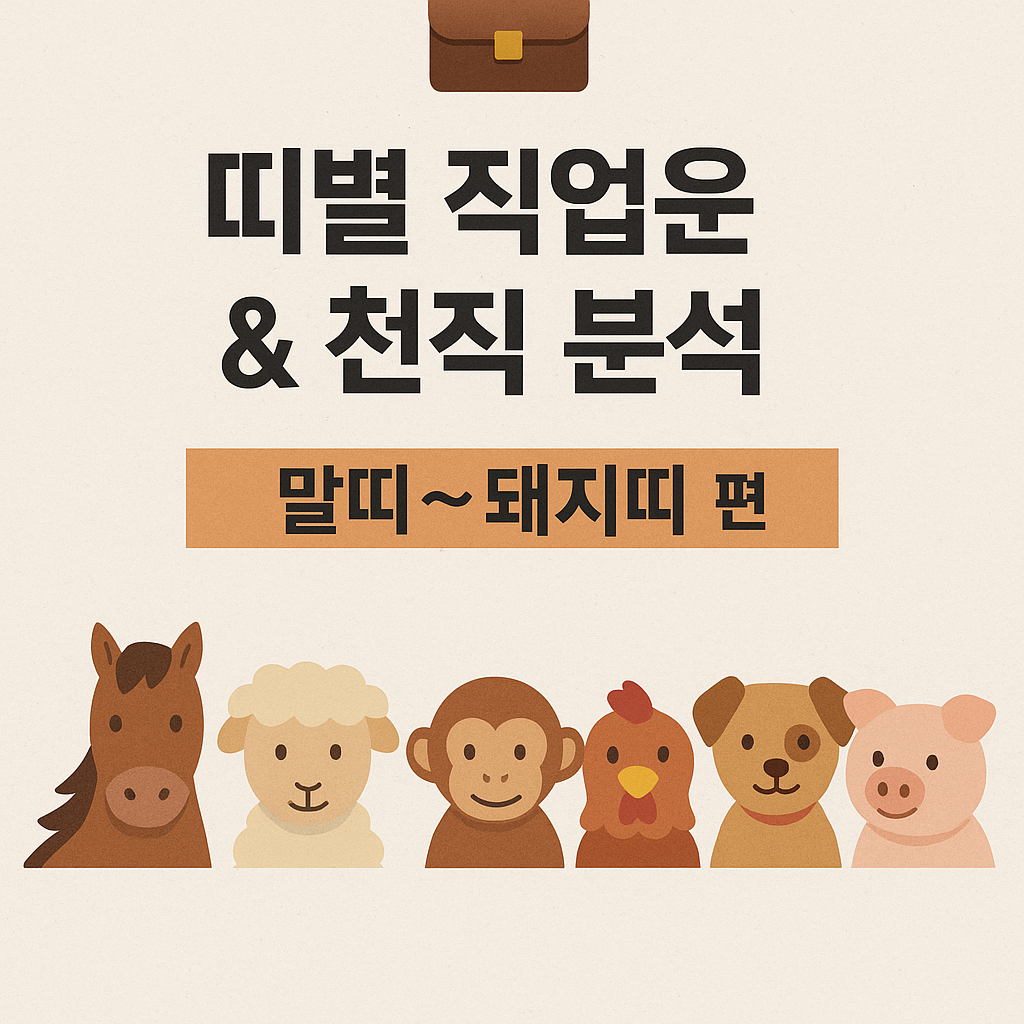 오늘은 말띠, 양띠, 원숭이띠, 닭띠, 개띠, 돼지띠의 직업운과 천직을 분석하고, 그 띠에 어울리는 커리어 방향과 성공 전략까지 정리해드립니다. 이번 분석을 통해 자신의 타고난 강점을 발견하고, 더 효율적으로 성공의 길을 걸을 수 있는 지혜를 얻으시길 바랍니다.