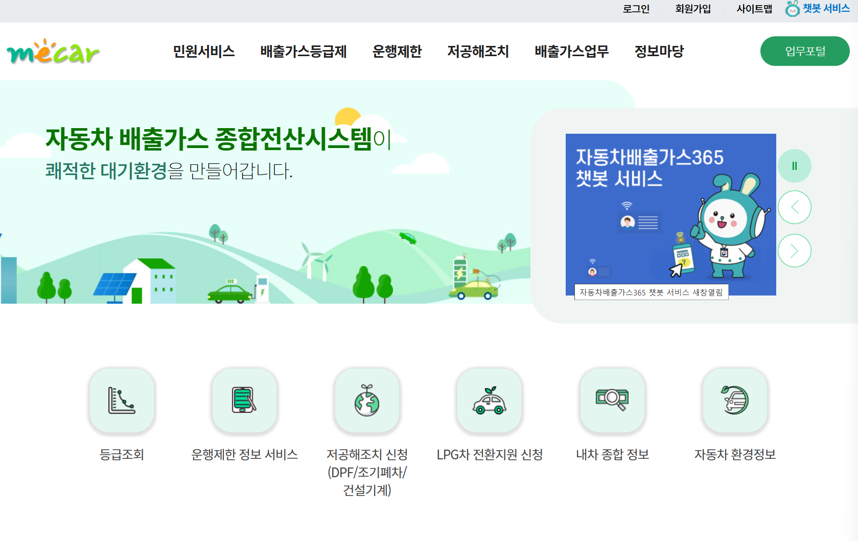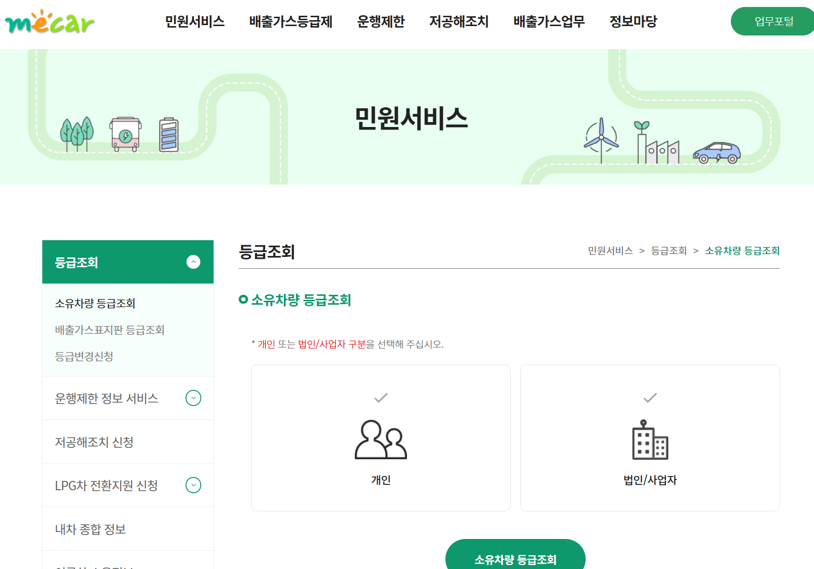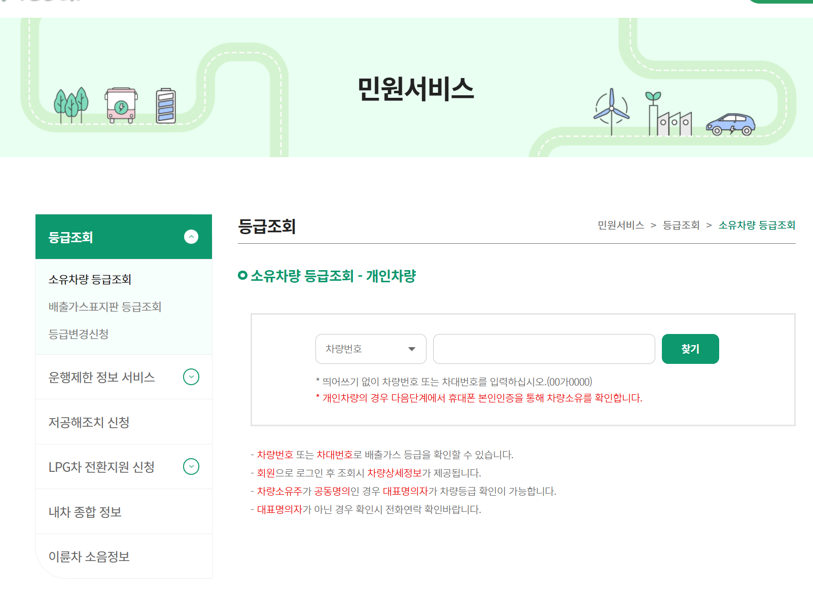 차량의 배출가스 등급은 환경부의 ‘자동차 배출가스 등급제’ 공식 사이트에서