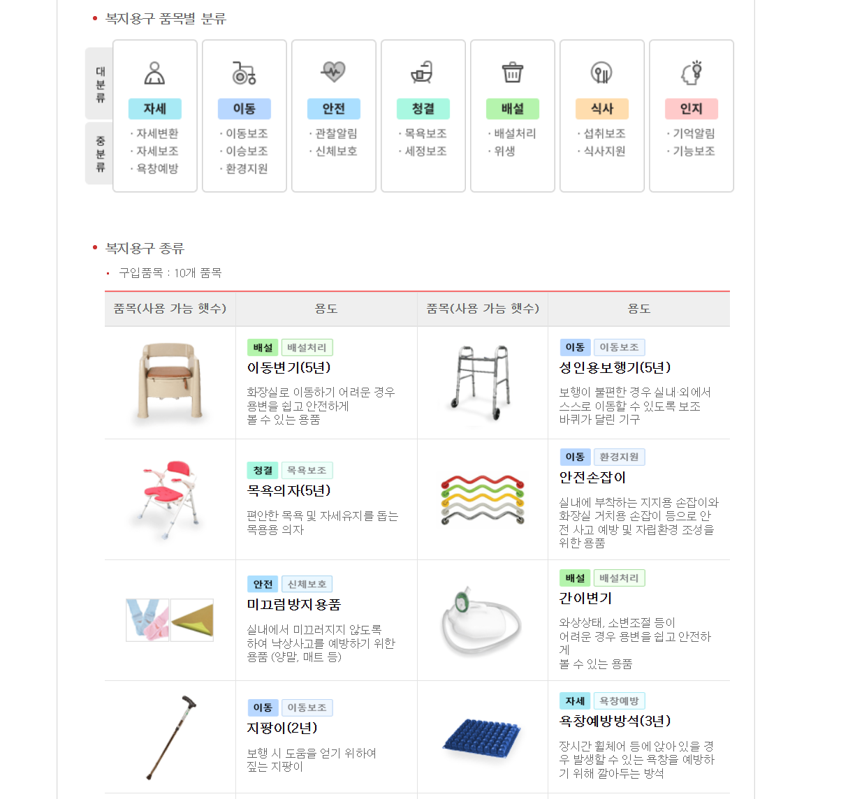 보행보조기부터 욕실 안전용품, 침대, 휠체어까지 다양한 품목이 지원되며,